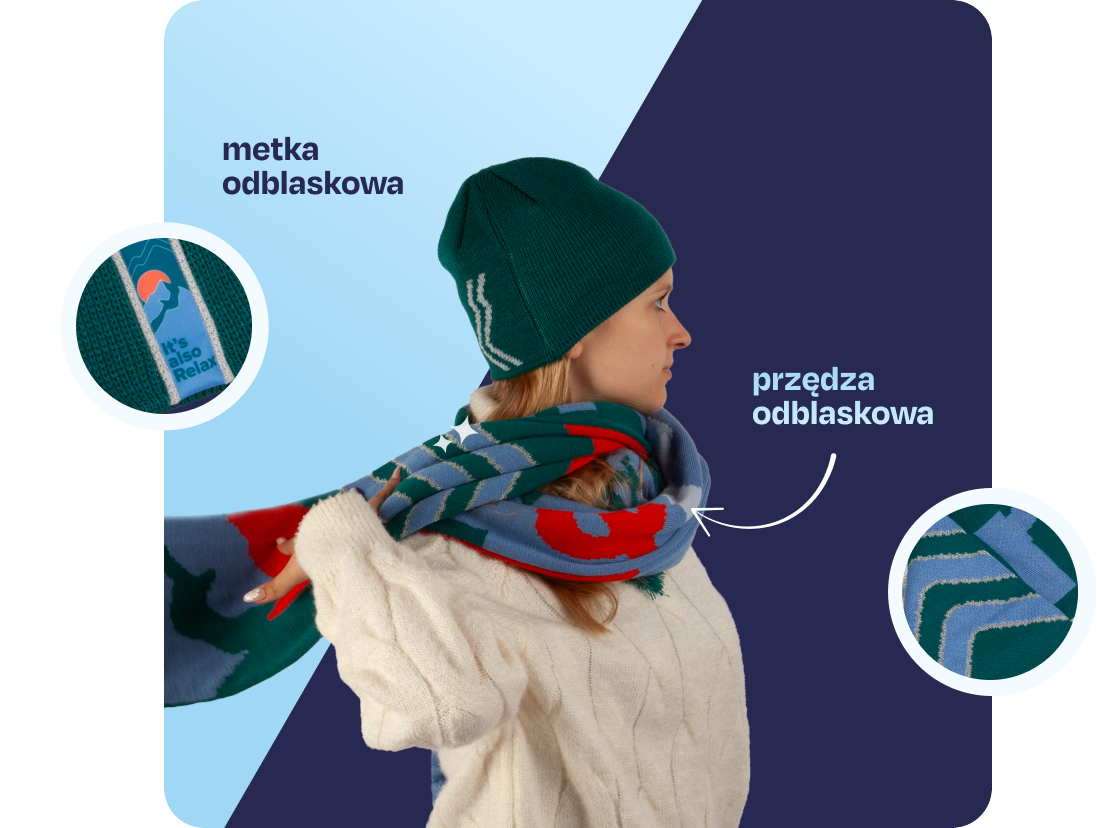 Personalizowany szalik odblaskowy zwiększa widoczność użytkownika dzięki zastosowaniu specjalnej przędzy odblaskowej. Przędza odblaskowa może być wpleciona w całą powierzchnię szalika odblaskowego albo stanowić tylko delikatny wzór, pas lub detal, który subtelnie połyskuje. Efekt można łatwo dopasować do charakteru projektu – od minimalistycznego akcentu po wyrazisty, mocno odblaskowy.